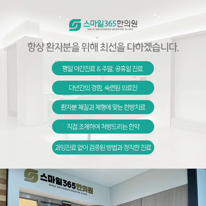 외에도 다양한 한방치료는 삼차신경통 원인과 동반되는 문제, 건강상태 등에 따라 다르게 적용되므로 검진 후 담당 의료진과 상담을 통해 확인할 수 있습니다. 스마일365한의원에서는 통합적인 한방치료로 칠성동 삼차신경통을 줄이고 신체회복을 도와드립니다.