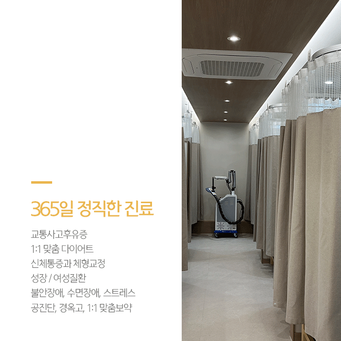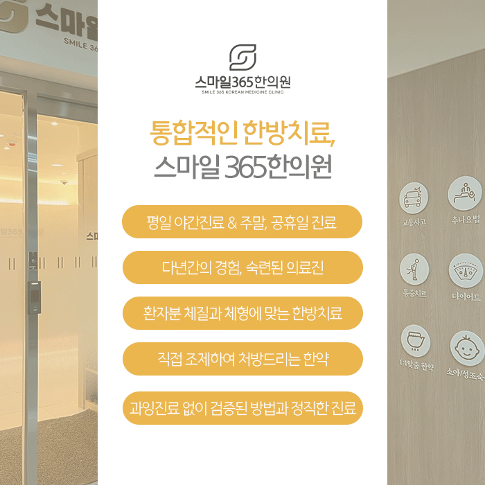 스마일365한의원에서는 통합적인 한방치료로 역류성식도염비 등 다양한 위장장애 개선과 담적으로 인한 문제 회복을 도와드립니다. 그리고 교통사고후유증, 1:1 맞춤 다이어트, 소아 및 어린이 성장, 신체통증과 체형교정, 여성질환, 불안장애, 수면장애, 스트레스, 공진단, 경옥고, 1:1 맞춤보약 등 진료합니다.