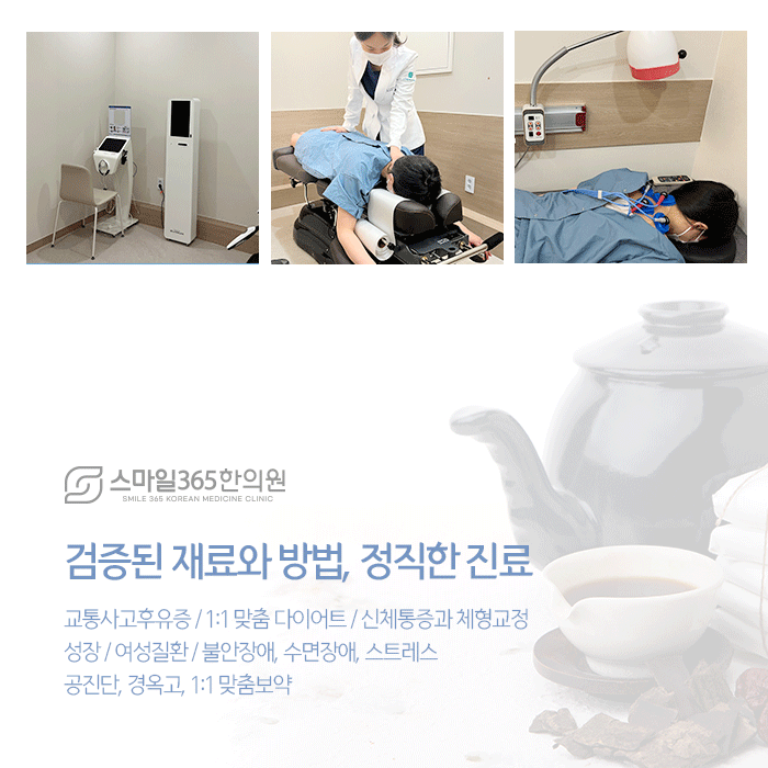 스마일365한의원에서는 통합적인 한방치료로 고성동 산후관리와 기력회복을 도와드립니다. 그리고 교통사고후유증, 1:1 맞춤 다이어트, 신체통증과 체형교정, 성장, 여성질환, 불안장애, 수면장애, 스트레스, 공진단, 경옥고, 1:1 맞춤보약 등 진료합니다. 과잉진료 없이 검증된 재료와 방법으로 정직한 진료를 약속드립니다. 매일 밤 8시까지 진료하며, 주말과 공휴일에는 3시까지 진료하고 있습니다.