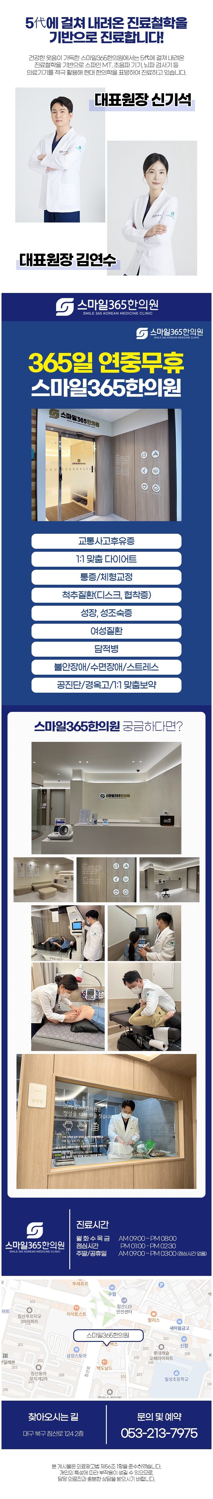 성내동 구내염치료 한의원에서는 통합적인 한방치료로 성내동 구내염치료를 진행합니다. 그리고 교통사고후유증, 1:1 맞춤 다이어트, 신체통증과 체형교정, 성장, 여성질환, 불안장애, 수면장애, 스트레스, 공진단, 경옥고, 1:1 맞춤보약 등 진료합니다. 과잉진료 없이 환자분에게 꼭 필요한 치료만 하며 검증된 재료와 방법으로 정직한 진료를 약속드립니다. 매일 밤 8시까지 진료하며, 주말과 공휴일에는 3시까지 진료하고 있으므로 참고하셔서 이용에 불편없으시길 바랍니다.