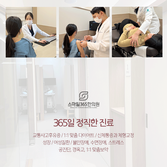 스마일365한의원에서는 통합적인 한방치료로 고성동 과민성방광으로 인한 증상 개선을 도와드립니다. 그리고 교통사고후유증, 1:1 맞춤 다이어트, 신체통증과 체형교정, 성장, 여성질환, 불안장애, 수면장애, 스트레스, 공진단, 경옥고, 1:1 맞춤보약 등 진료합니다.